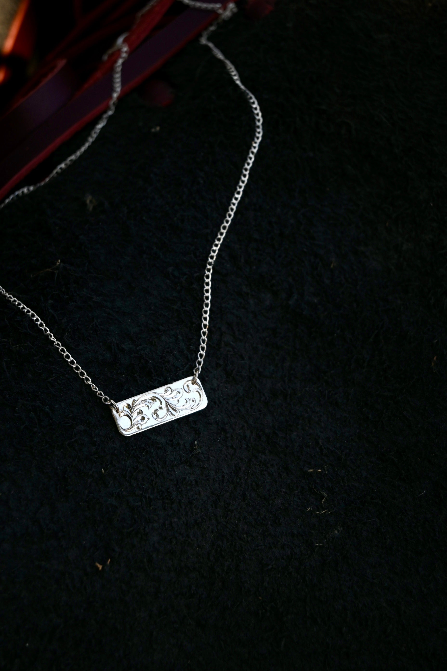 A hand engraved bar with soft, flowing scrollwork. This necklace brings a calm, feminine touch to everyday Western style and layers effortlessly with your favorite pieces.